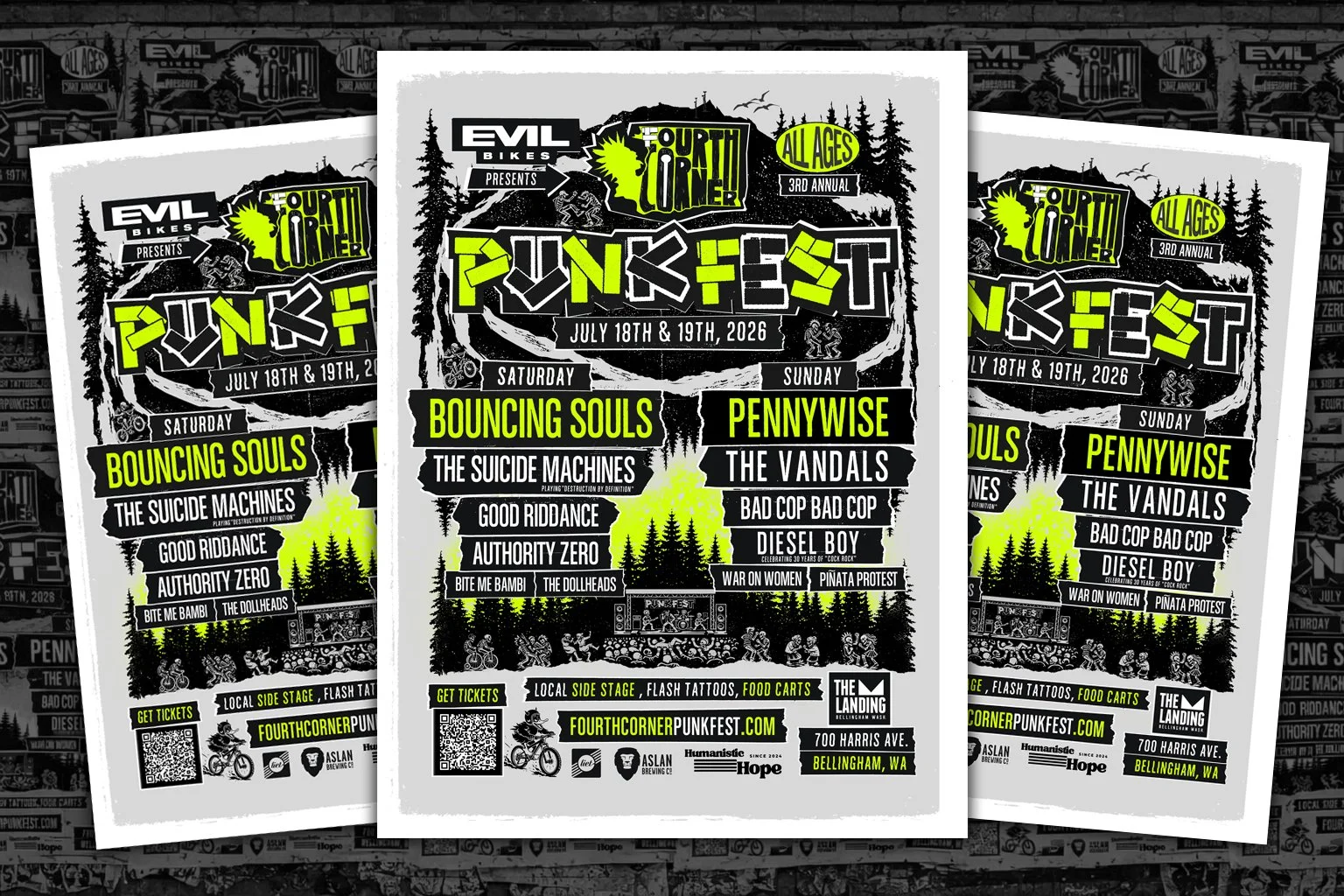Born out of a love for a genre that not only shaped how we listen to music, but how we see the world. Fourth Corner Punk is Bellingham Washington’s unapologetic spotlight on the long overlooked punk scene of the Pacific Northwest. In our 2nd year partnering with EVIL bike, FCPF is more than tripling its size, doubling its days and bringing in internationally touring punk bands Pennywise, Bouncing Souls and dozens more. Featuring more local PNW punk bands, more punk adjacent local artists and accommodating more punks of all ages. New vendors serving up flash tattoos, mohawks, hair color, skateboards and vinyl. Adult Beverages all day in the Aslan Brewery beer gardens. Food served by local food trucks. Games, Giveaways, Prizes, Trivia and so much more.